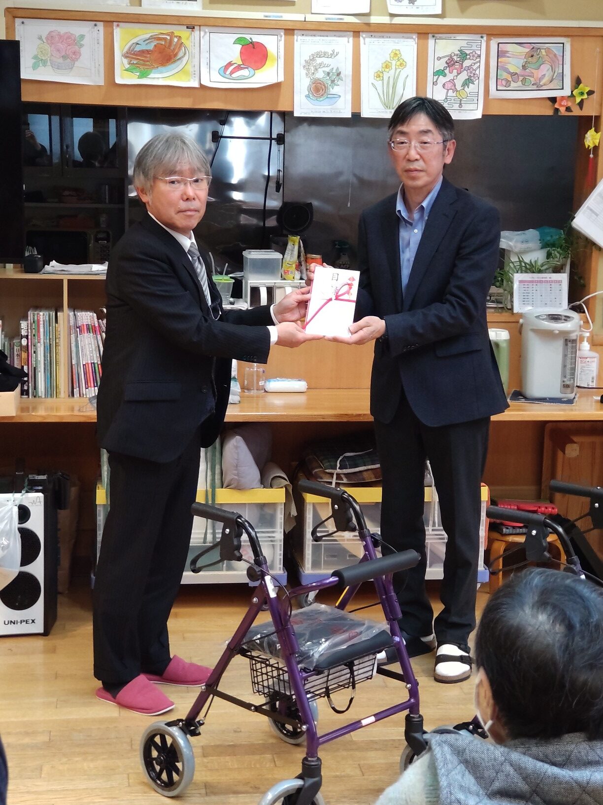 特別養護老人ホーム第二白水荘では、主にデイサービスのご利用者様が安全に歩行されますようお使いになられます。頂戴しました歩行器は早速ご利用者様にお使いいただき、快適に過ごしていただいております。